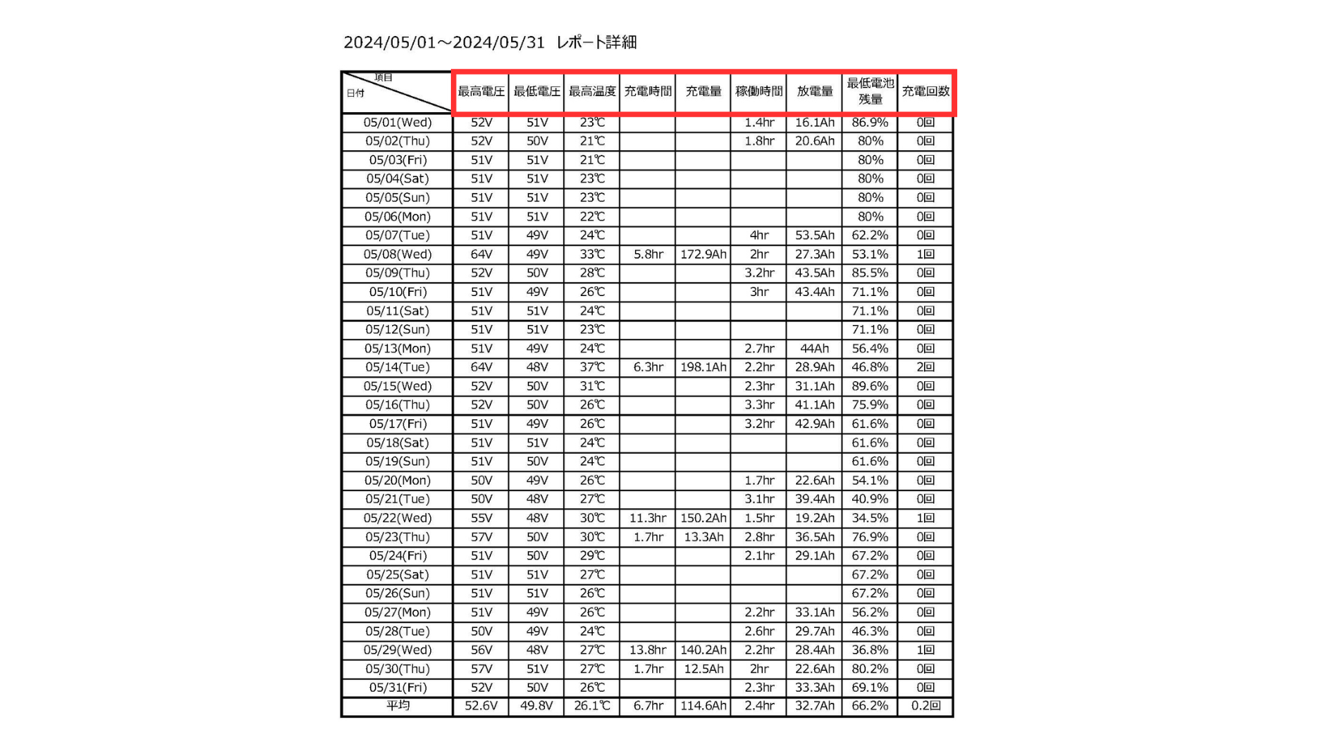 下のレポートは、日々の稼働状況及びバッテリーの運用が一覧で把握できる形式のものです。