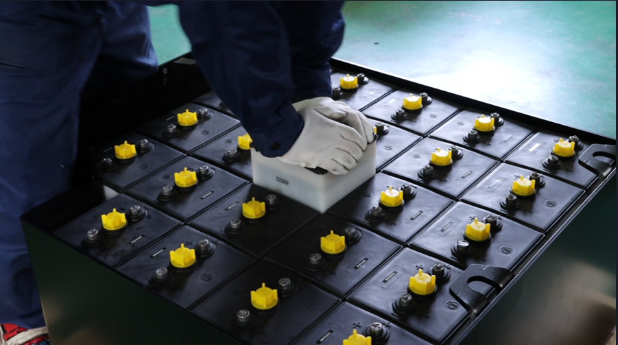 フォークリフトのバッテリーは、複数のセル(単電池)で構成されています。