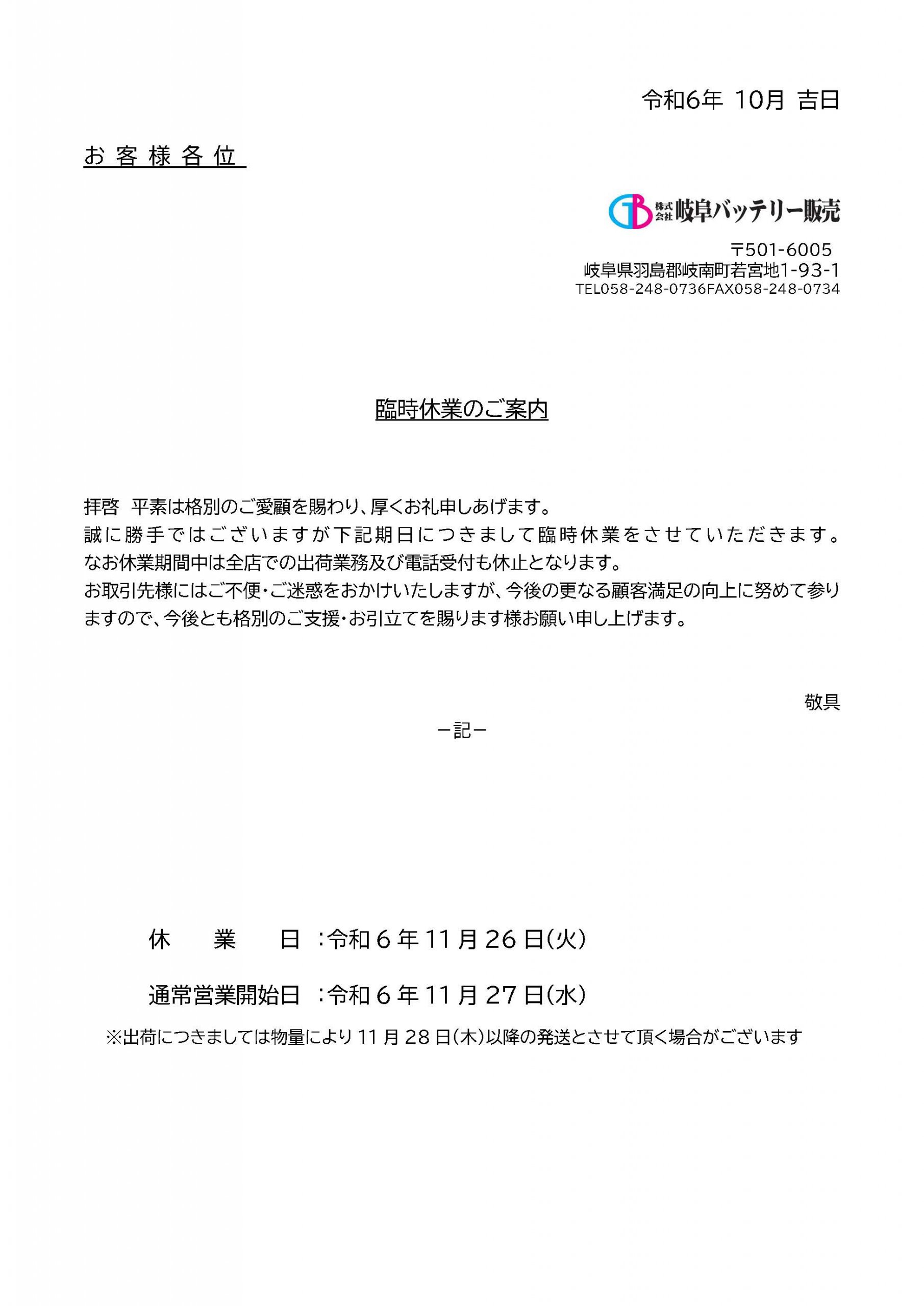 臨時休業案内(2024.11.26)