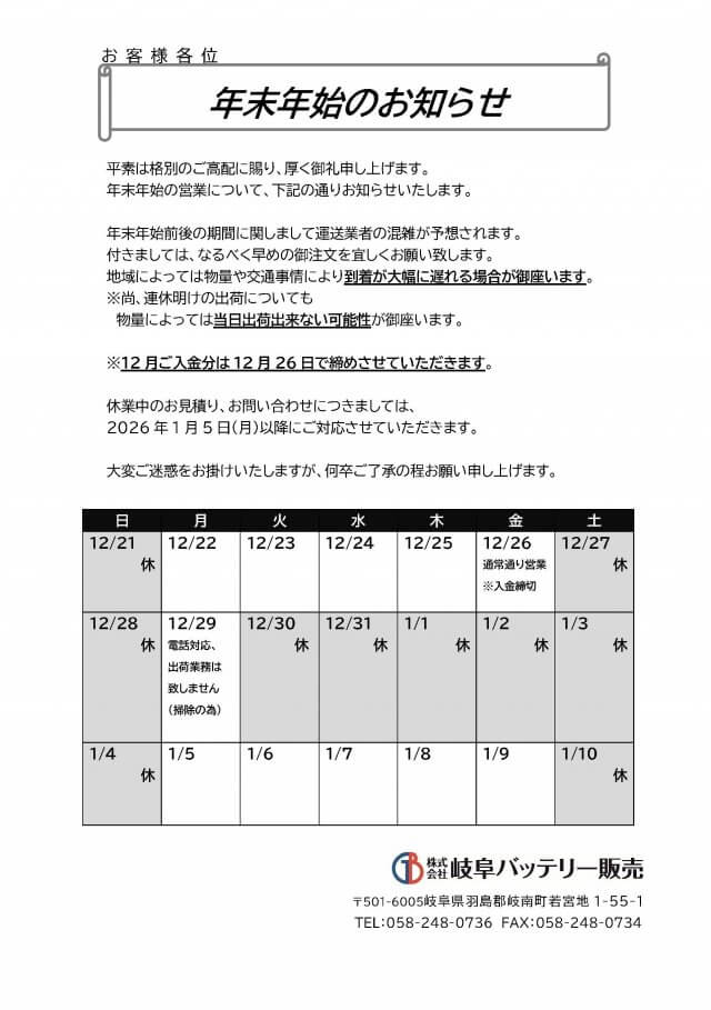 2025年年末年始休業のお知らせ(2025.12.30-2026.1.4)